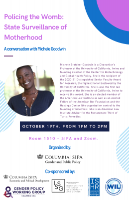 October 19, 2021 at 1pm ETRoom 1510 SIPA and ZoomJoin the Gender and Public Policy Concentration at SIPA for a conversation with Professor Michele Goodwin, an internationally recognized voice on women’s rights and reproductive health, including the rising regulation of pregnancy and criminalization of women. Registration is available for in-person and Zoom options (Professor Goodwin will join us via Zoom). Click below to registerEvent link