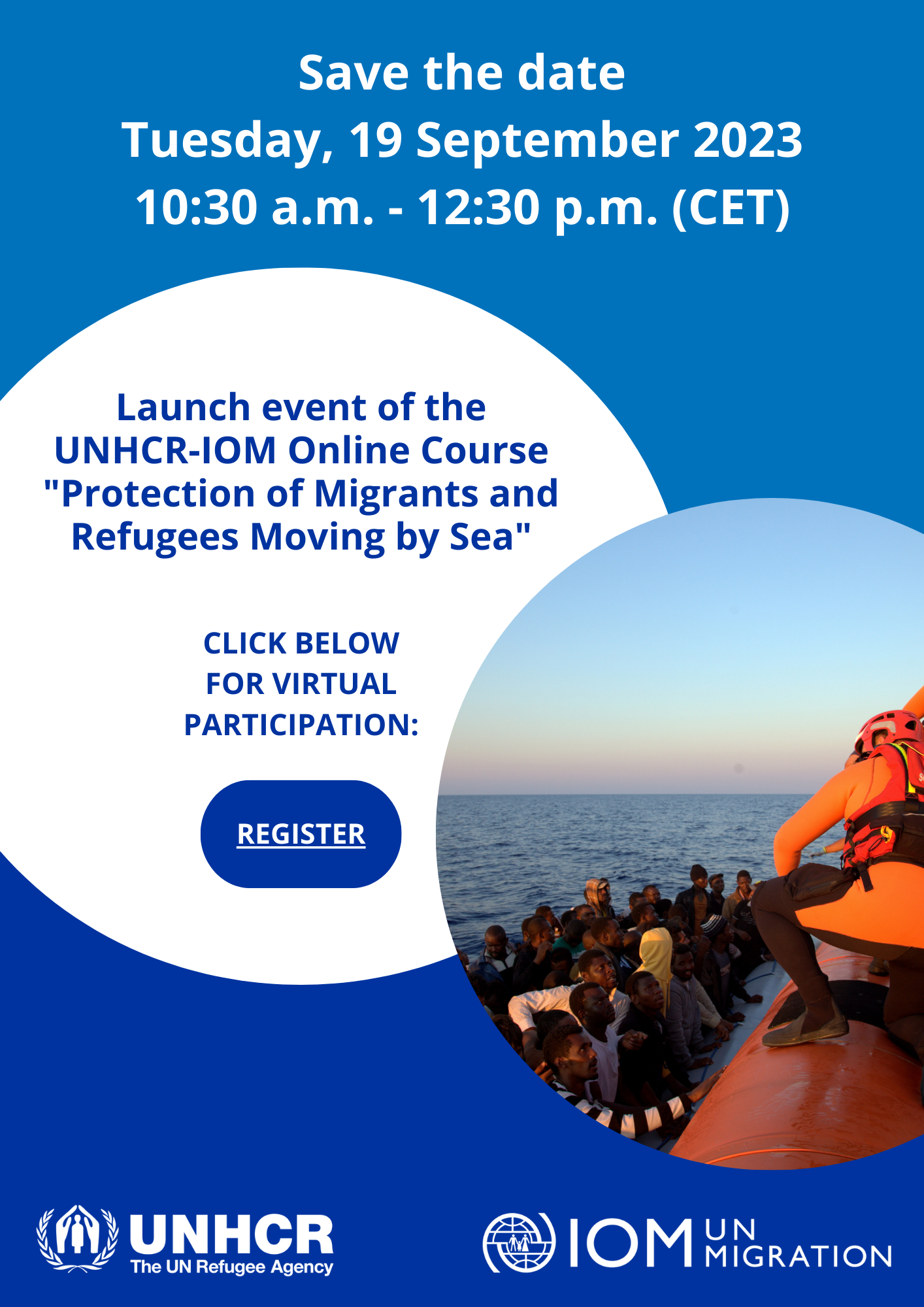 Tuesday, 19 September 2023, 10:30 a.m. - 12:30 p.m. (Central European Time)OnlineSave the date: Launch event of the UNHCR-IOM online course “The Protection of Migrants and Refugees Moving by Sea” Tuesday, 19 September 2023, 10:30 a.m. - 12:30 p.m. (Central European Time) UNHCR and IOM are both pleased to invite you to virtually attend (Zoom) the launch event of the joint Online Course "The Protection of Migrants and Refugees Moving by Sea", to be held on 19 September 2023 from 10:30 a.m. to 12:30 p.m. (Central European Time - CET). Please click below to register for virtual participation.Event link