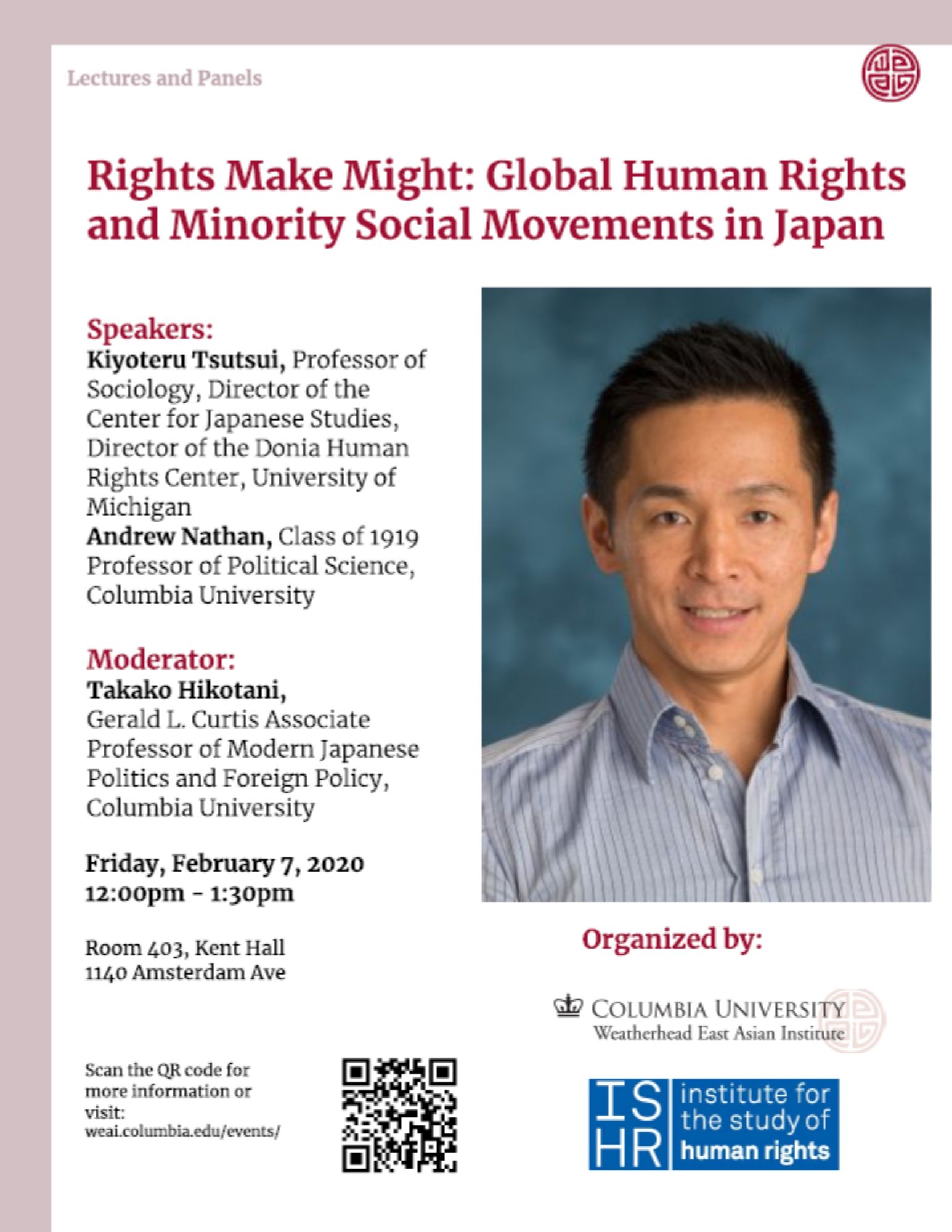 Friday, February 7, 2020 12:00 PM - 1:30 PMKent Hall, 1140 Amsterdam Ave., New York, NY 10027 403Please join us for a lecture with: Kiyoteru Tsutsui, University of Michigan Andrew Nathan, Class of 1919 Professor of Political Science, Columbia University Why have the three most salient minority groups in Japan - the politically dormant Ainu, the active but unsuccessful Koreans, and the former outcaste group of Burakumin - all expanded their activism since the late 1970s despite the unfavorable domestic political environment? My investigation into the history of activism by the three groups reveals that a key factor was the galvanizing effects of global human rights on local social movements. Drawing on interviews and archival data, I document the transformative impact of global human rights ideas and institutions on minority activists, which changed the prevalent understanding about their standing in Japanese society and propelled them to new international venues for political claim making. The global forces also changed the public perception and political calculus in Japan over time, catalyzing substantial gains for the minority movements. Having benefited from global human rights, all three groups repaid their debt by contributing to the consolidation and expansion of international human rights principles and instruments. The in-depth historical comparative analysis offers rare windows into local, micro-level impact of global human rights and contributes to our understanding of international norms and institutions, social movements, human rights, ethnoracial politics, and Japanese society. Click below to see the event on the Columbia events calendar.Event link