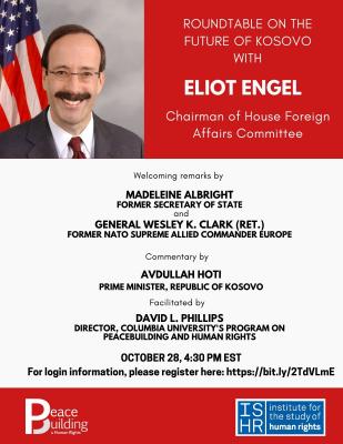 Wednesday, October 28, 2020 4:30 PM - 5:30 PMOnline Roundtable on the future of Kosovo with Eliot Engel, Chairman of House Foreign Affairs Committee. Welcoming remarks by Former Secretary of State Madeleine Albright and General Wesley K. Clark (ret.) Former NATO Supreme Allied Commander Europe. Commentary by Avdullah Hoti, Prime Minister, Republic of Kosovo. Facilitated by David L. Phillips, Director, Columbia University's Program on Peacebuilding and Human Rights. For Zoom login information, please register here: https://bit.ly/2TdVLmE Click below to see the event on the Columbia events calendar.Event link