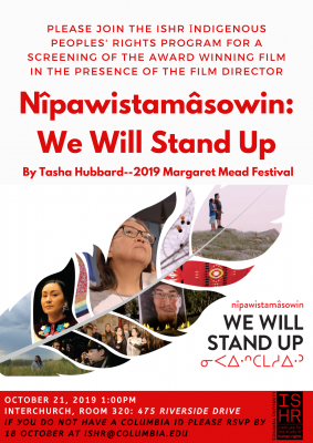 Monday, October 21, 2019 1:00 PM - 2:00 PMInterchurch Center, 475 Riverside Dr., New York, NY 10027 Room 320CPlease join the ISHR Indigenous Peoples' Rights Program for a screening of the award winning film, in the presence of the film director, Nîpawistamâsowi: We Will Stand Up On August 9, 2016, a young Cree man named Colten Boushie died from a gunshot to the back of his head after entering Gerald Stanley’s rural property with his friends. The jury’s subsequent acquittal of Stanley captured international attention, raising questions about racism embedded within Canada’s legal system and propelling Colten’s family to national and international stages in their pursuit of justice. Sensitively directed by Tasha Hubbard, nîpawistamâsowin: We Will Stand Up weaves a profound narrative encompassing the filmmaker’s own adoption, the stark history of colonialism on the Prairies, and a vision of a future where Indigenous children can live safely on their homelands. ***If you do not have a Columbia ID please RSVP by 18 October at ishr@columbia.edu*** Click below to see the event on the Columbia events calendar.Event link