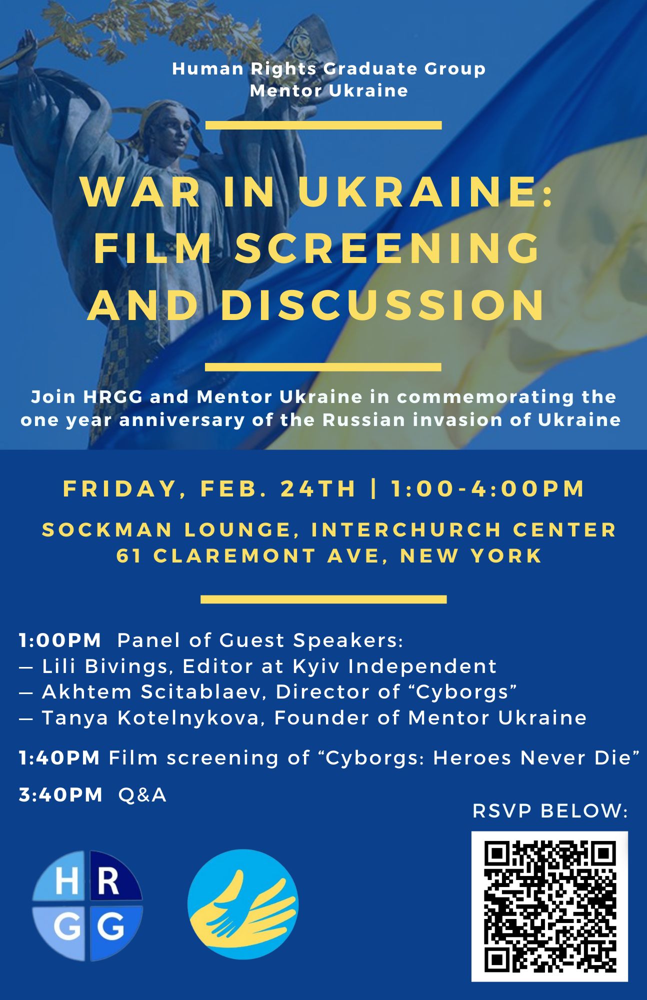 February 24th is going to commemorate the anniversary of the Russian full-scale invasion of Ukraine. To commemorate the year of hardships, heroism, and sacrifices of the Ukrainian people, the Human Rights Graduate Group is proud to cordially invite you to a very special panel and film screening to mark this monumental occasion.