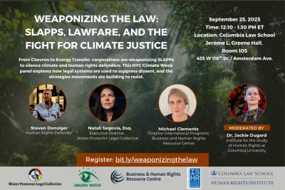 Thursday, September 25, 2025 12:10 PM - 1:30 PMColumbia Law School, 435 W. 116 St., New York, NY 10027 | Room/Area: JGH 105Please join the Columbia Law School Human Rights Institute, the Columbia University Institute for the Study of Human Rights, the Business & Human Rights Centre, the Water Protector Legal Collective, and Amazon Watch for a timely panel during NYC Climate Week examining how corporations are using SLAPPs (Strategic Lawsuits Against Public Participation) to silence climate and human rights defenders. Legal and advocacy experts will discuss how legal systems are being weaponized to suppress dissent, and the strategies that communities and movements are building to resist. Speakers Include: Dr. Jackie Dugard, Senior Lecturer, Institute for the Study of Human Rights, Columbia University Steven Donziger, Human Rights Defender and Environmental Justice Advocate Michael Clements, Director International Programs, Business and Human Rights Resource Centre Natali Segovia, Executive Director, Water Protector Legal Collective When: Thursday, September 25, 2025 | 12:10–1:30 PM Where: Columbia Law School | Jerome Greene Hall | Room 105 Lunch will be served. Please RSVP. Click below to registerEvent link
