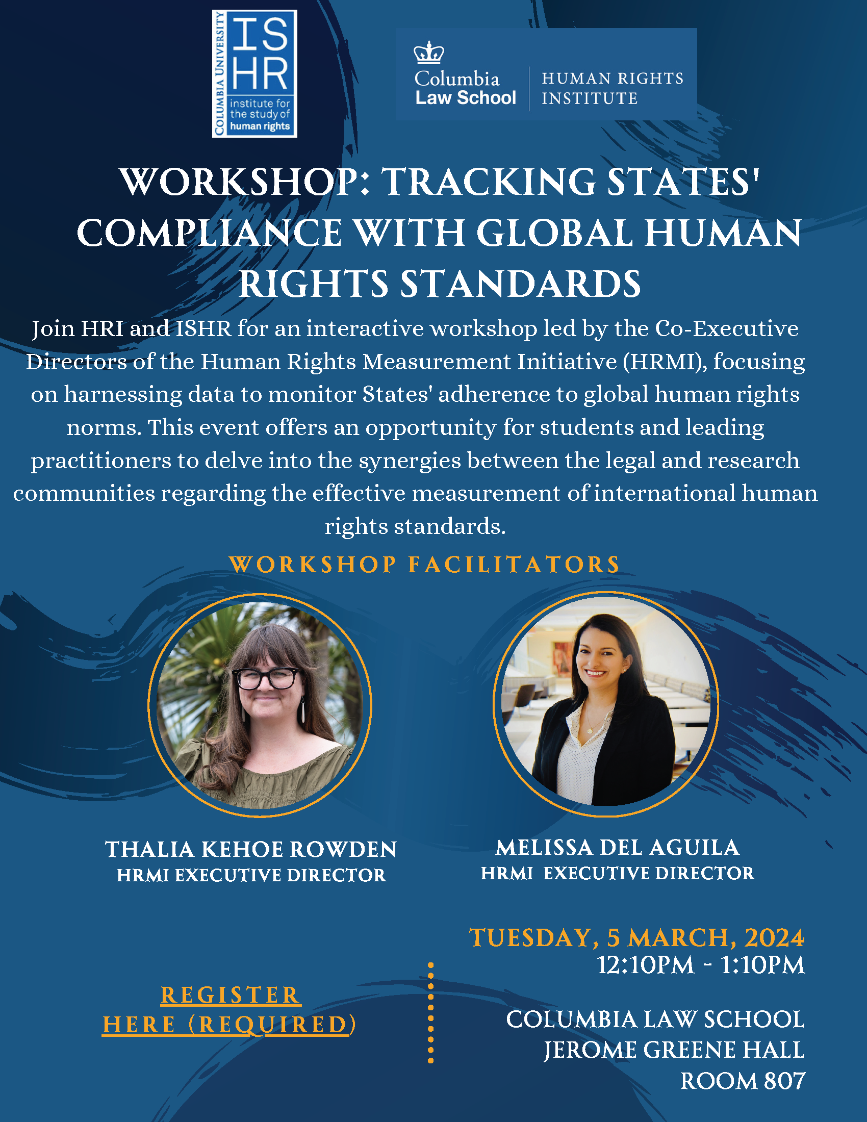 March 05, 2023 | 12:10pm to 1:10pm Jerome Greene Hall | Room 807Join HRI and ISHR for an interactive workshop led by the Co-Executive Directors of the Human Rights Measurement Initiative (HRMI), focusing on harnessing data to monitor States' adherence to global human rights norms. This event offers an opportunity for students and leading practitioners to delve into the synergies between the legal and research communities regarding the effective measurement of international human rights standards. Due to limited seating capacity, registration is mandatory for attendance at this event. Co-sponsored by: Columbia Law School Human Rights Institute Columbia University Institute for the Study of Human Rights Click below to registerEvent link