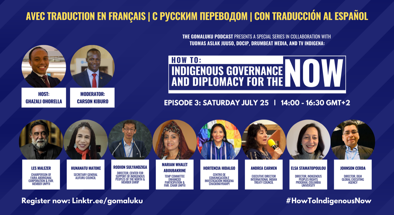 The Institute’s Indigenous Peoples Rights Program was pleased to participate in the initiative of indigenous leaders, media and support organizations. A series of webinars under the title “How to: Indigenous Governance and Diplomacy for the NOW” has been organized for July and August 2020 by The Gomaluku Podcast in collaboration with Tuomas Aslak Juuso (President of the Saami Parliament in Finland), DOCIP (Center for Documentation of Indigenous Peoples), Drumbeat Media and TV Indigena.