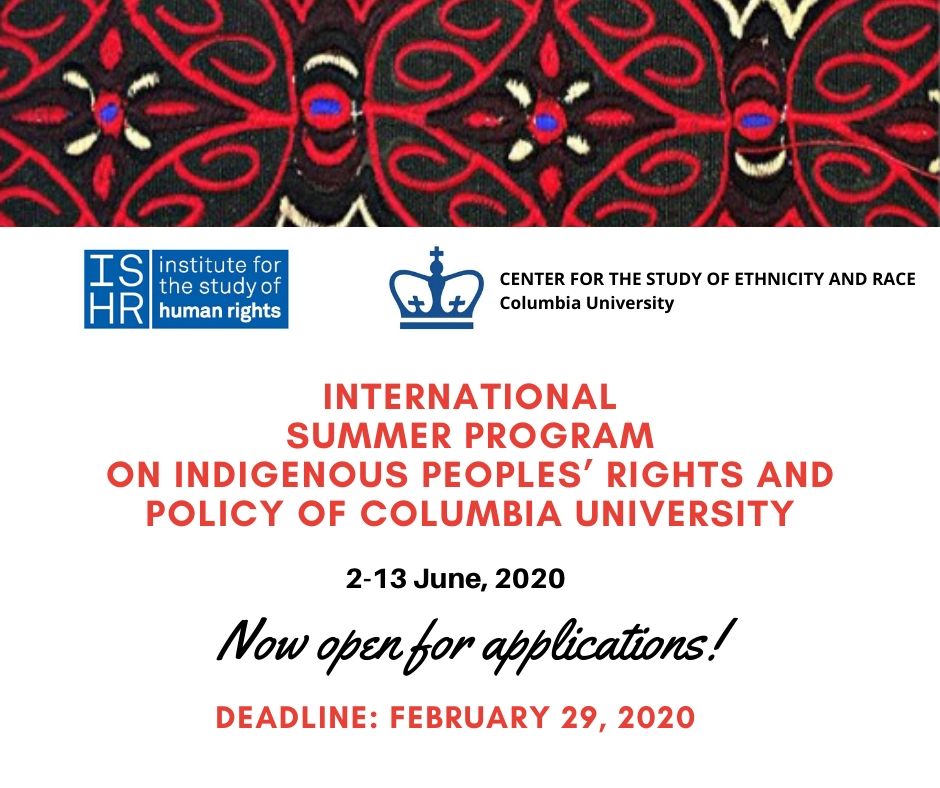Columbia University's ISHR and Center for the Study of Ethnicity and Race are glad to inform you that they are now accepting applications for the 2020 International Summer Program on Indigenous Peoples' Rights and Policy (ISSP). The deadline for submissions is February 29, 2020. For more information about the program and how to apply, download the program flyer and application here. All application materials, and any questions about the program, should be sent to columbia.indigenous@gmail.com.