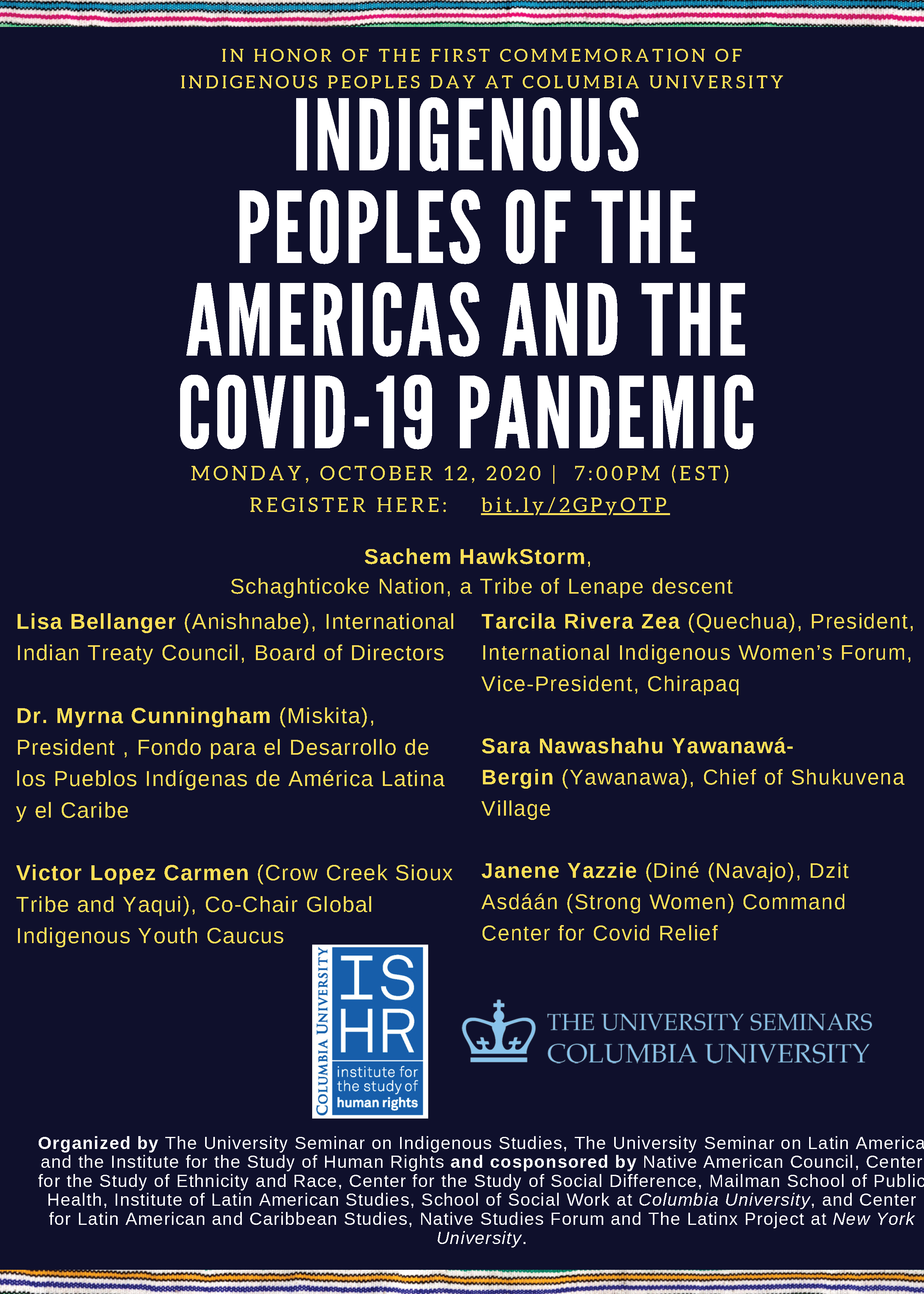After a welcome by Sachem HawkStorm from the Schaghticoke First Nation, a Tribe of Lenape descent, and opening remarks by Professor Peter Winn, Chaiperson of the University Seminar on Latin America, panelists spoke as follows: Lisa Bellanger, Anishinabe/Dakota from the Leech Lake Band of Ojibwe, American Indian Movement-Exec Director; Dr. Myrna Cunningham (Miskita), President Fondo para el Desarrollo de los Pueblos Indígenas de América Latina y el Caribe; Victor Lopez Carmen, (Crow Creek Sioux Tribe and Yaqui), Co-Chair Global Indigenous Youth Caucus; Tarcila Rivera Zea (Quechua), President, International Indigenous Women’s Forum, Vice-President, Chirapaj; Sara Nawashahu Yawanawá-Bergin (Yawanawa), Chief of Shukuvena Village, Brazil; Janene Yazzie, (Diné (Navajo)), Dzit Asdáán (Strong Women) Command Center for Covid Relief.