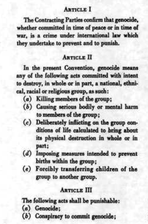 The Genocide Convention (Article 2) defines genocide as “any of the following acts committed with intent to destroy, in whole or in part, a national, ethnical, racial or religious group … “, including: