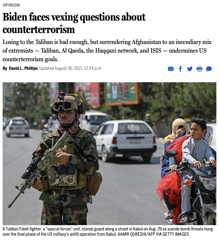 Last week the director of ISHR's Program on Peacebuilding and Human Rights - David L. Phillips - wrote an op-ed in The Boston Globe entitled "Biden faces vexing questions about counterterrorism". In it, he analyzes what the Biden administration can take away from the developments in Afghanistan.