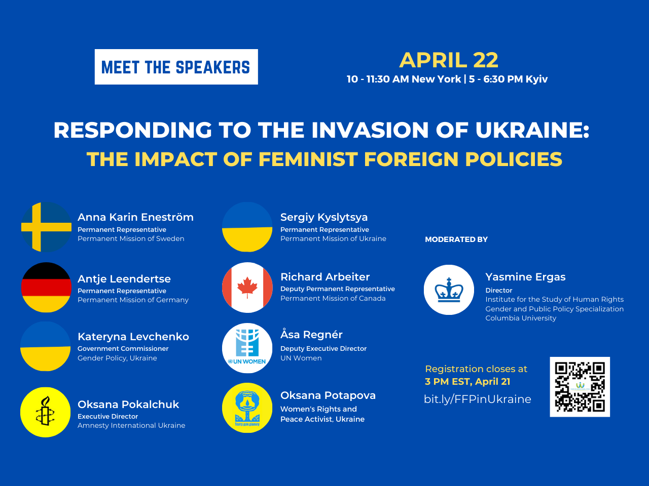 On April 22, 2022, the Women and Gender in Global Affairs Network at the Institute for the Study of Human Rights and the Permanent Missions of Sweden and Ukraine to the United Nations together with co-sponsors hosted an online discussion on “