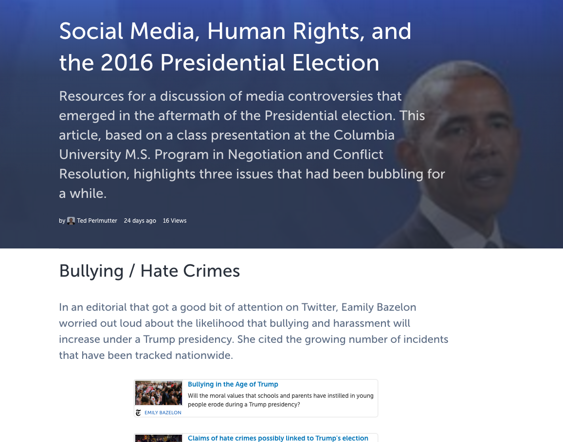 Social Media, Human Rights, and the 2016 Presidential Election is a project developed by Professor Ted Perlmutter in Storify that will be used in his graduate level "Social Media and Human Rights: Advocacy, Actors, and Analytics" course in Spring 2017. The project deals with hate crimes, free speech, and news integrity, issues that are not new, but which have a different valence as a consequence of the 2016 presidential election.