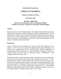 David L. Phillips, Director of the Program on Peace-building and Rights, addressed a Conference in the National Assembly of France on US-Turkey relations and the situation in Syria (17 February 2017). His remarks focus on US-Turkish relations. They address the prospect of improving relations between Turkey and the United States, during President Donald J. Trump’s administration. Remarks also consider potential areas of agreement between the US and Turkey, as well as flash points in US-Turkey relations. Flash points include Turkey’s demand for the extradition of Fethullah Gülen and discontinuation of US security cooperation with Syrian Kurds.